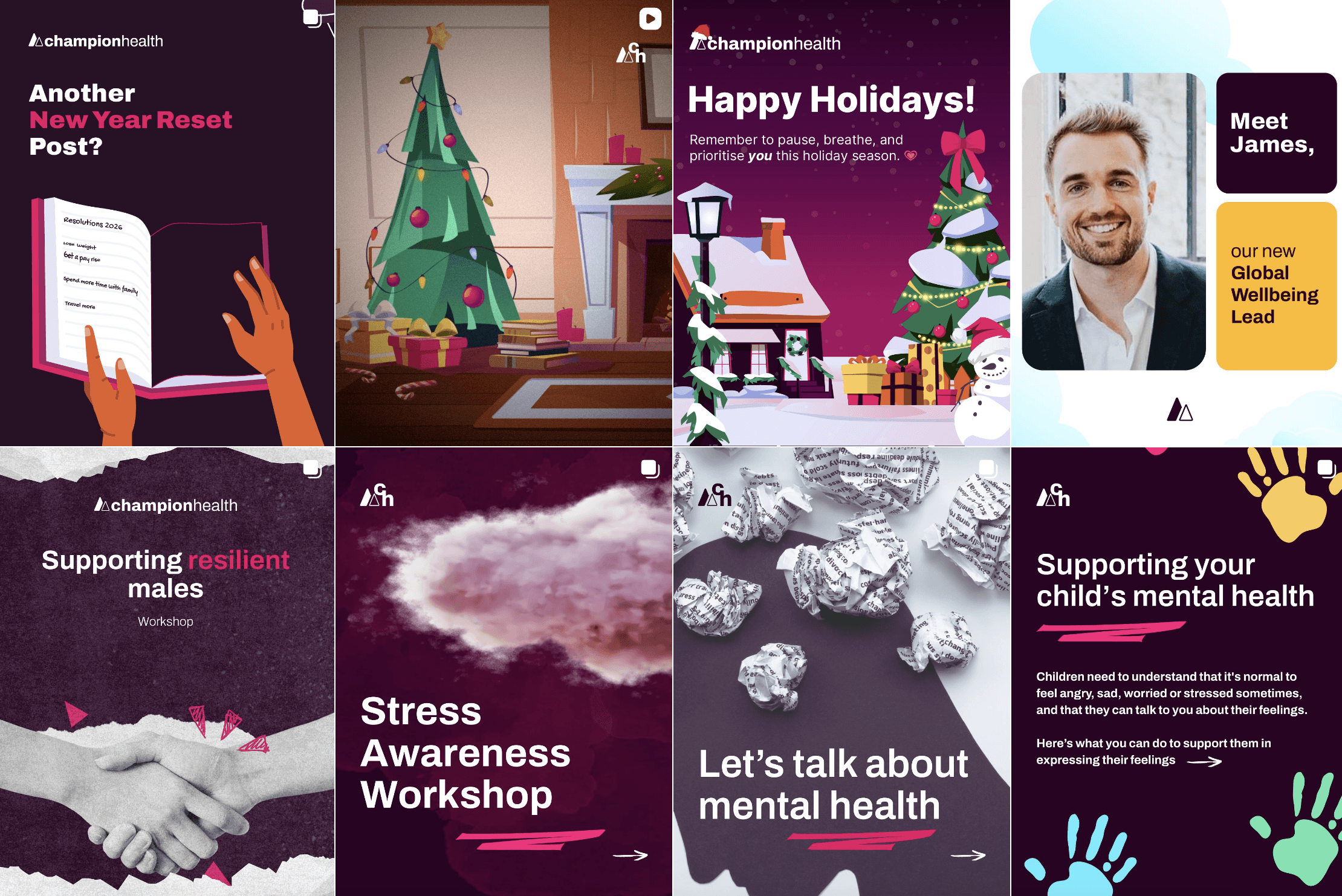 Champion Health is a workplace wellbeing platform focused on mental health, physical health, and preventative care. Because the brand operates in a sensitive, people-centred space, the goal of the rebrand wasn’t to reinvent the company, but to refine how it shows up visually, emotionally, and practically for its audience.