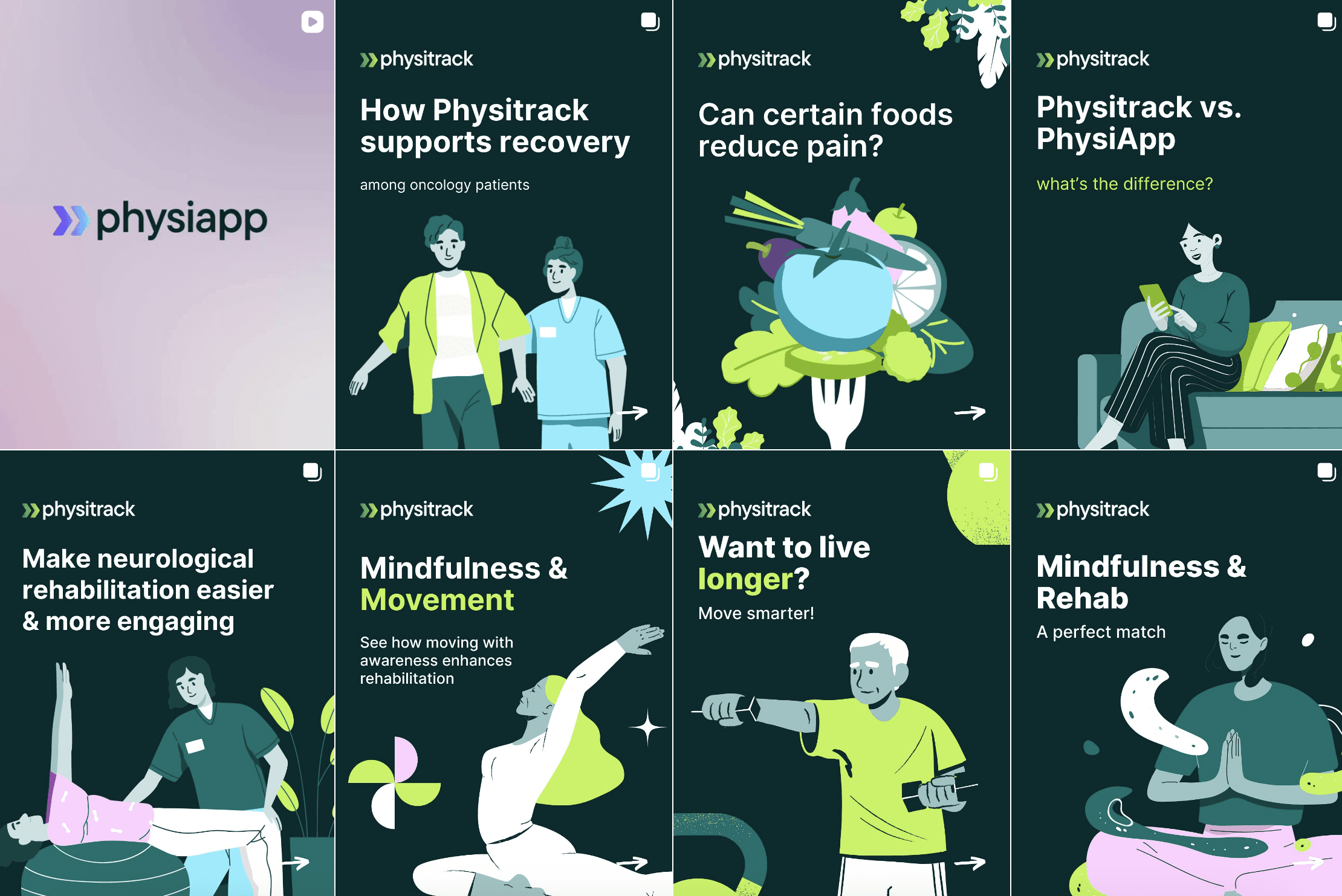 Physitrack’s new identity includes a new logo, color scheme, typeface and a comprehensive style guide for the whole group. All sub-groups have been re-branded as well in order to maintain consistency and be recognised as a group.